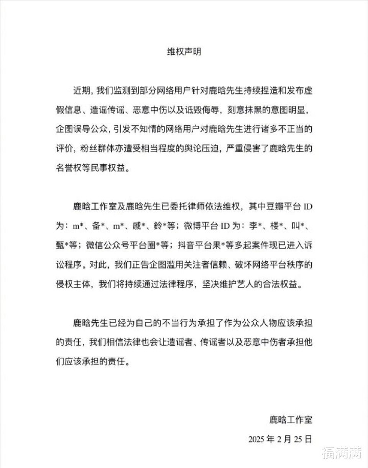 咱都知道,在网络这个大江湖里,真真假假的消息那是满天飞。这次鹿晗工作室指出,部分网络用户持续对鹿晗进行恶意操作,又是捏造虚假信息,又是造谣传谣,还恶意中伤、诋毁侮辱,这一连串的“组合拳”打得可真够狠,摆明了就是想抹黑鹿晗,误导大众,让不明真相的网友跟风给出各种不正当评价,连粉丝群体都跟着遭罪,承受了不小的舆论压力。